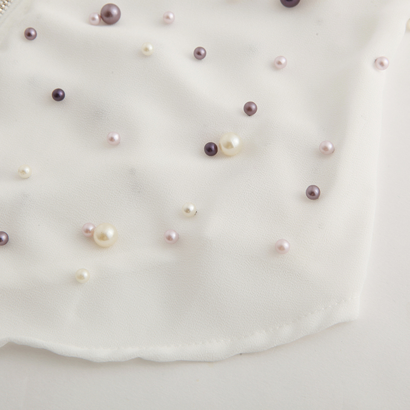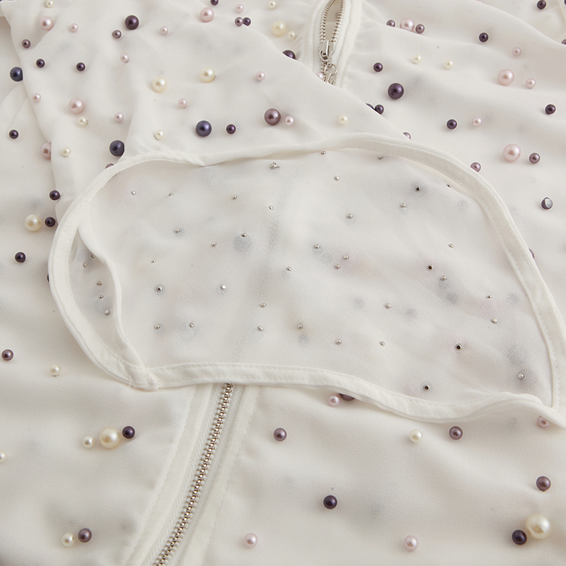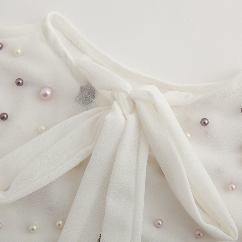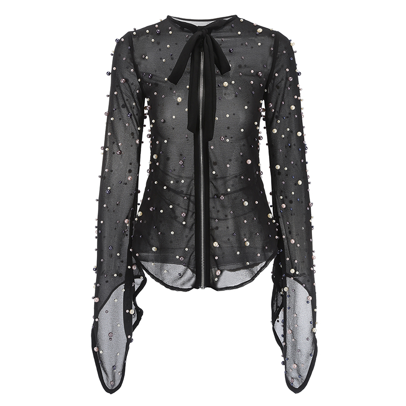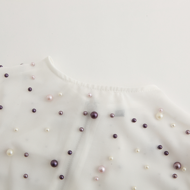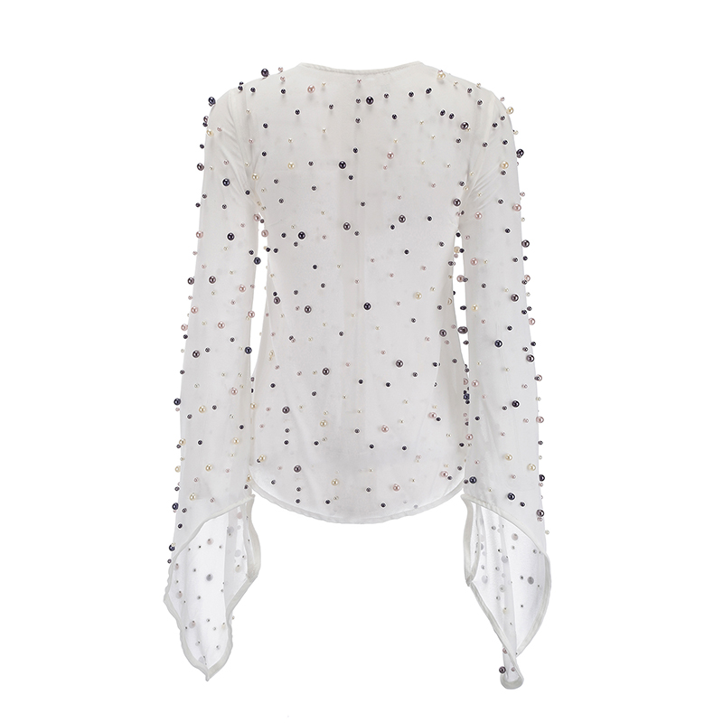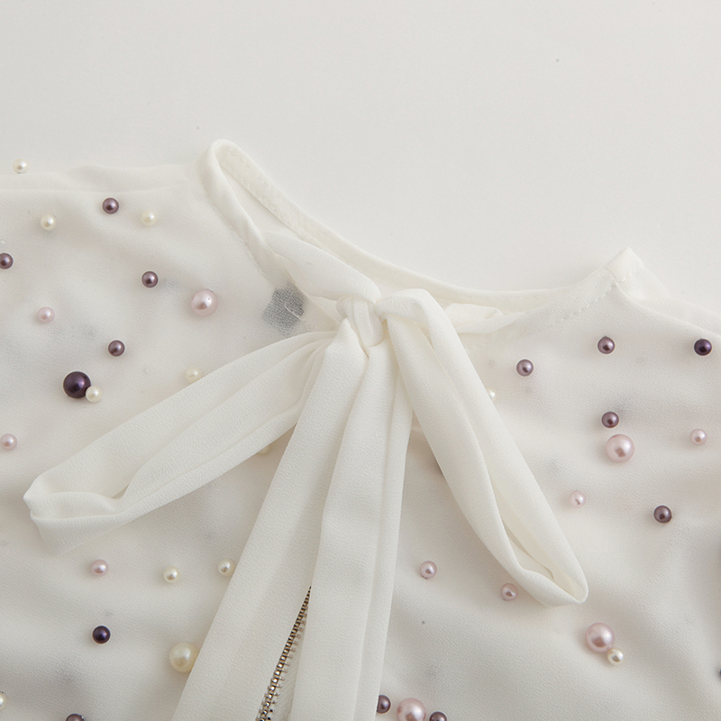 - Design: This season is about having a flowing and agile top, with a lightweight and breathable fabric that exudes a gentle temperament. The upper body is comfortable, and there is plenty of skin friendly looseness, emitting a gentle and dynamic feeling anytime and anywhere. The bow design at the neck is neat and elegant, shaping the temperament. The overall nail beads make the outfit look unique, with ultra long cuffs that showcase the slender arms while also exuding elegance.