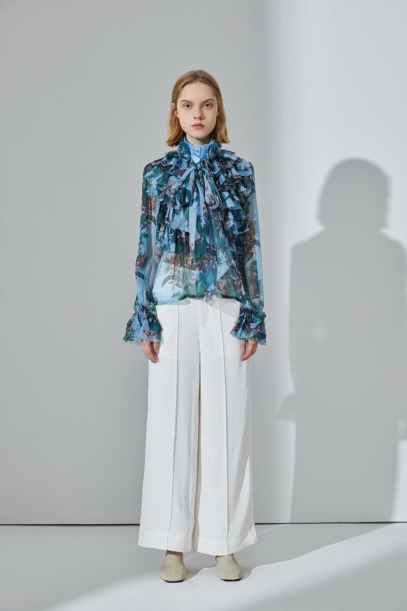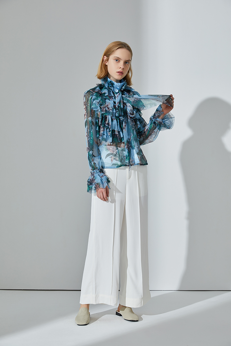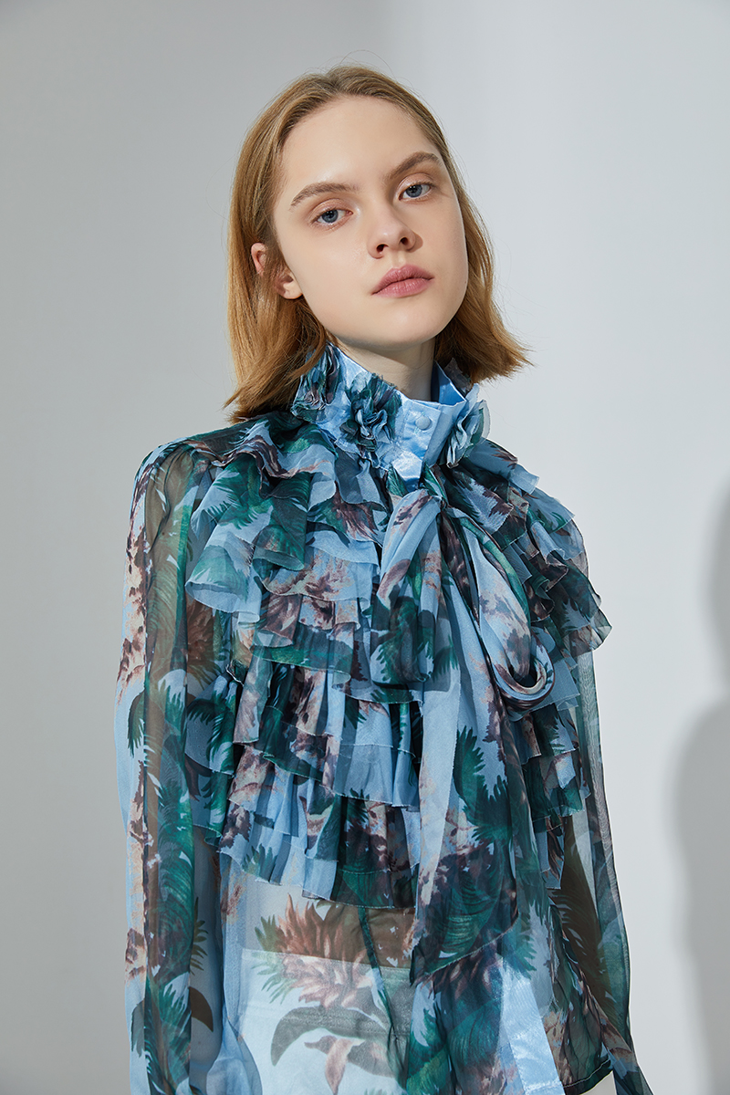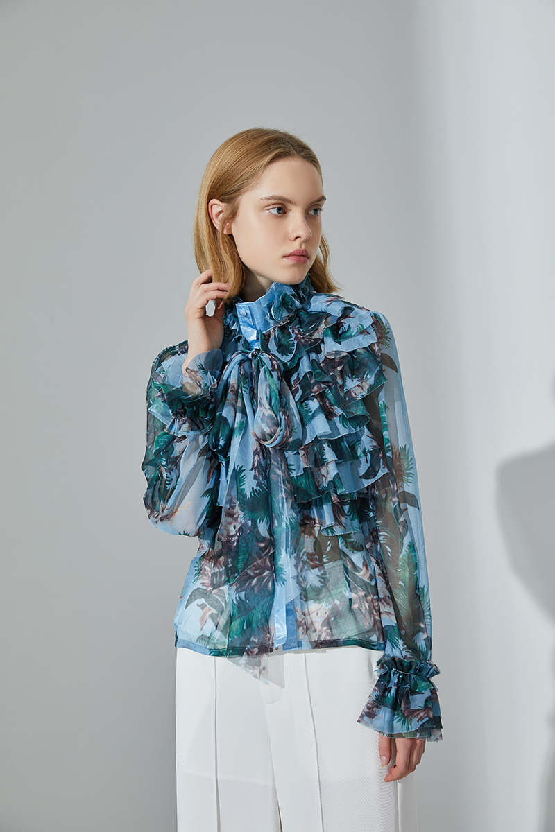 - Design: Effortlessly feminine and chic, this crinkle chiffon sheer blouse has a slightly oversized silhouette, a romantic necktie, and slim sleeves detailed with ruffles. Layer over a cami, tucked into a pencil skirt and go from work to cocktails with ease.