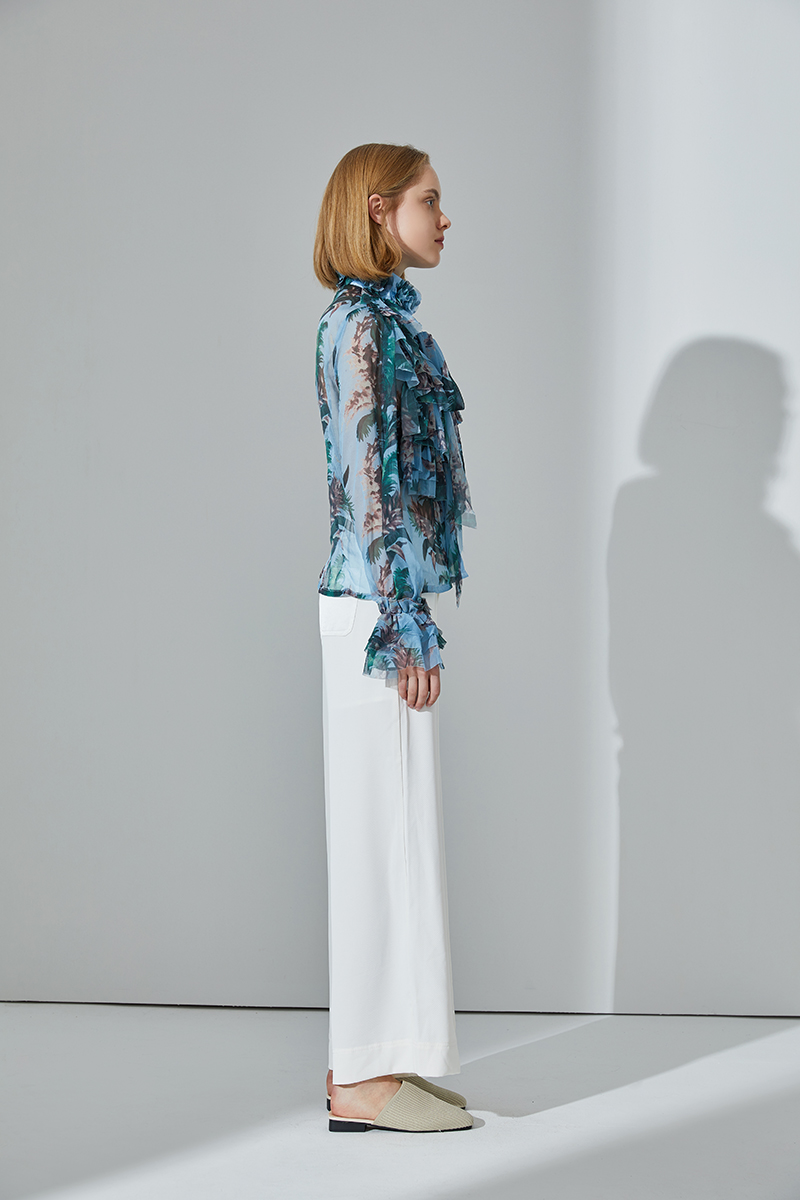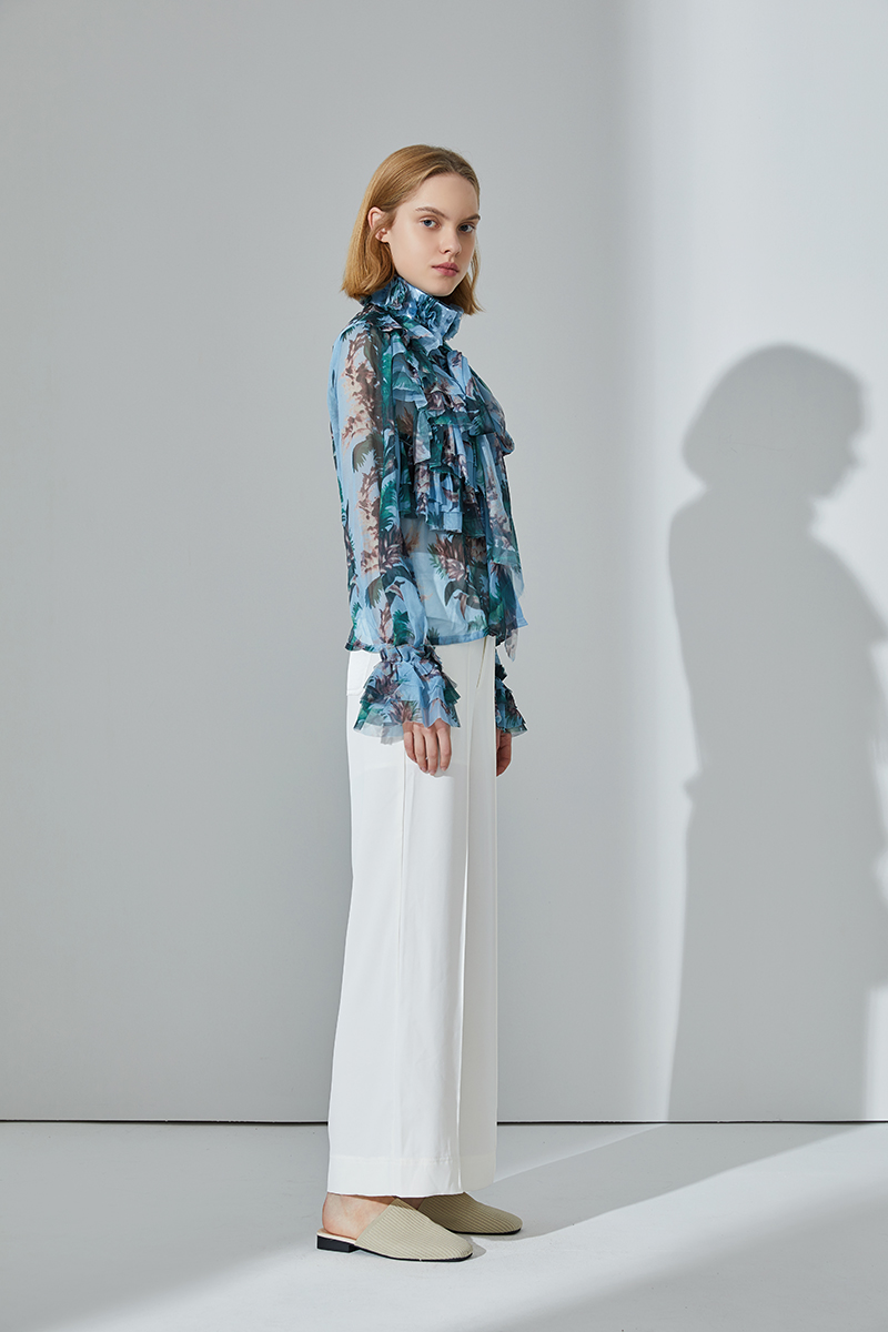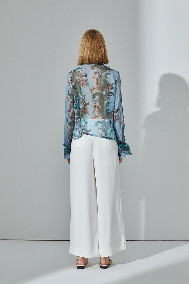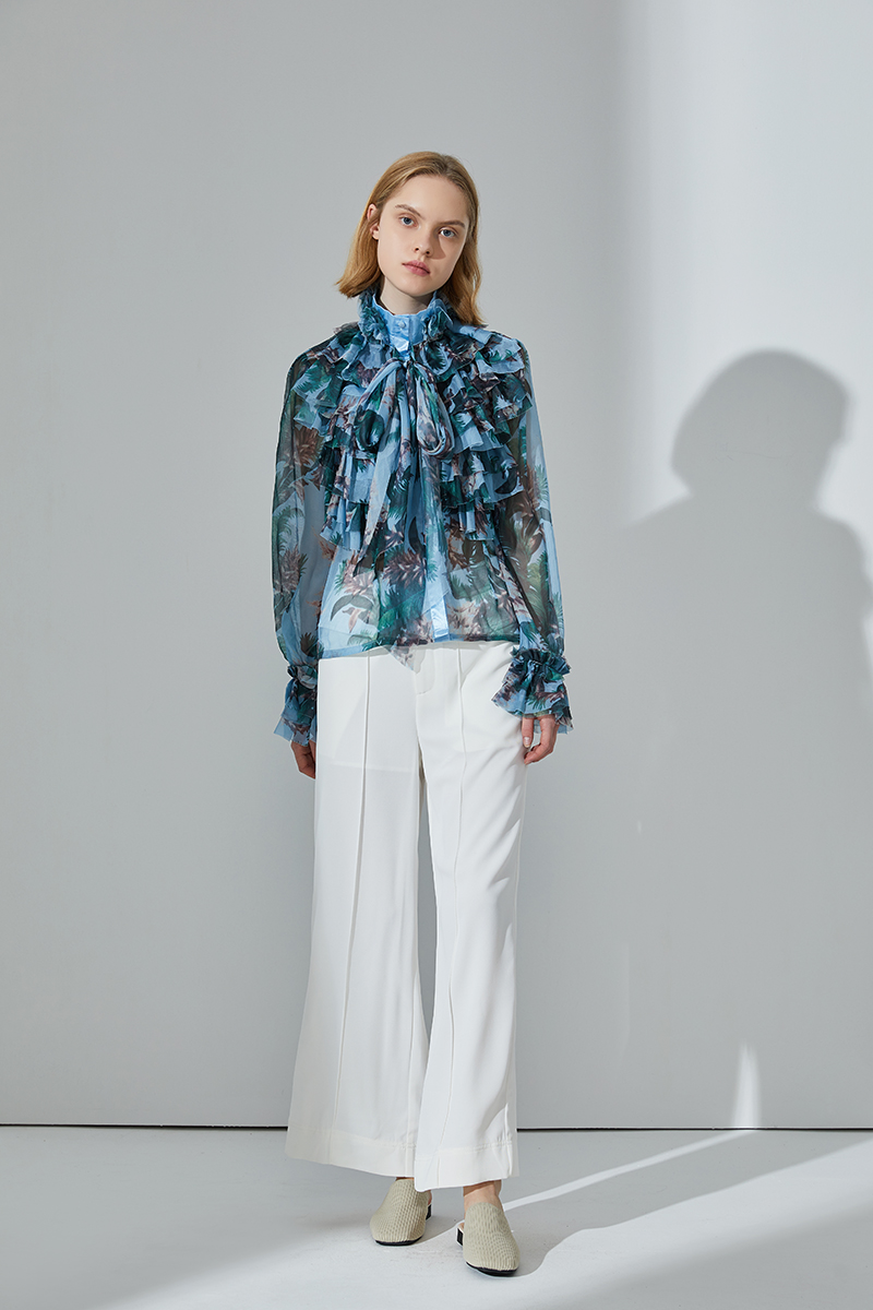 - Design: Effortlessly feminine and chic, this crinkle chiffon sheer blouse has a slightly oversized silhouette, a romantic necktie, and slim sleeves detailed with ruffles. Layer over a cami, tucked into a pencil skirt and go from work to cocktails with ease.