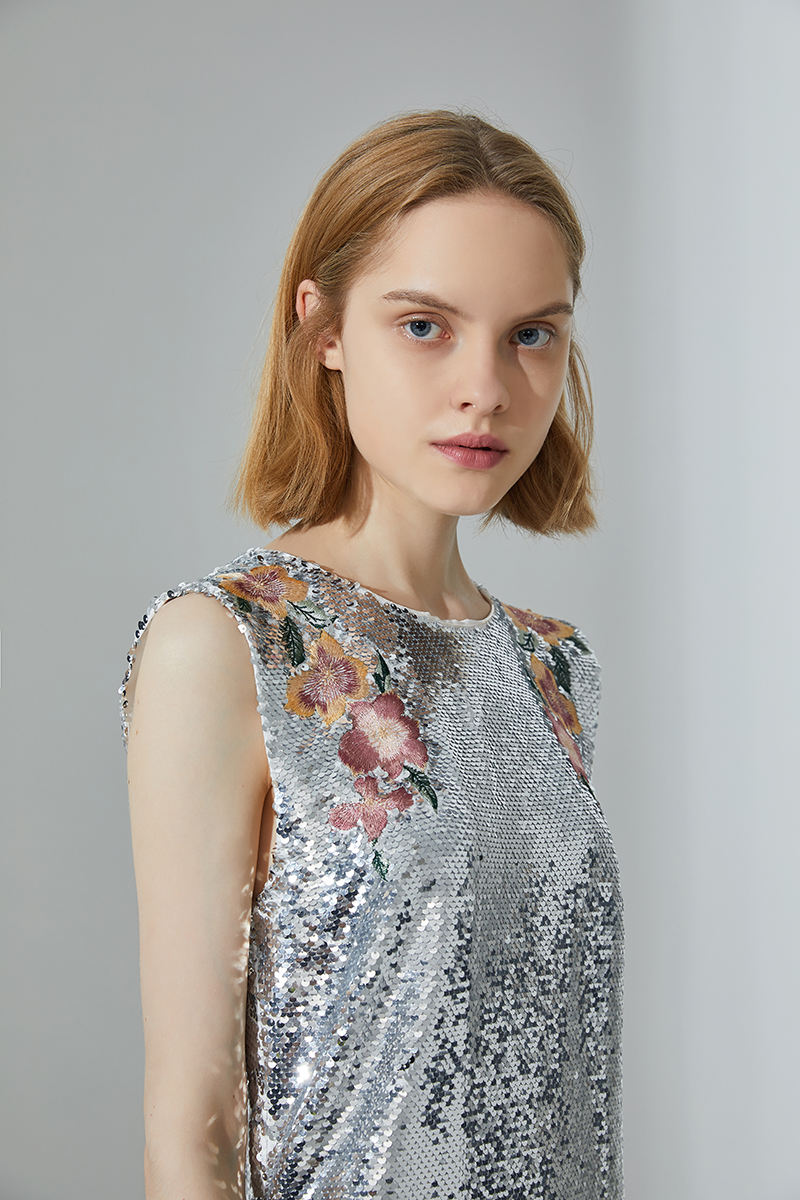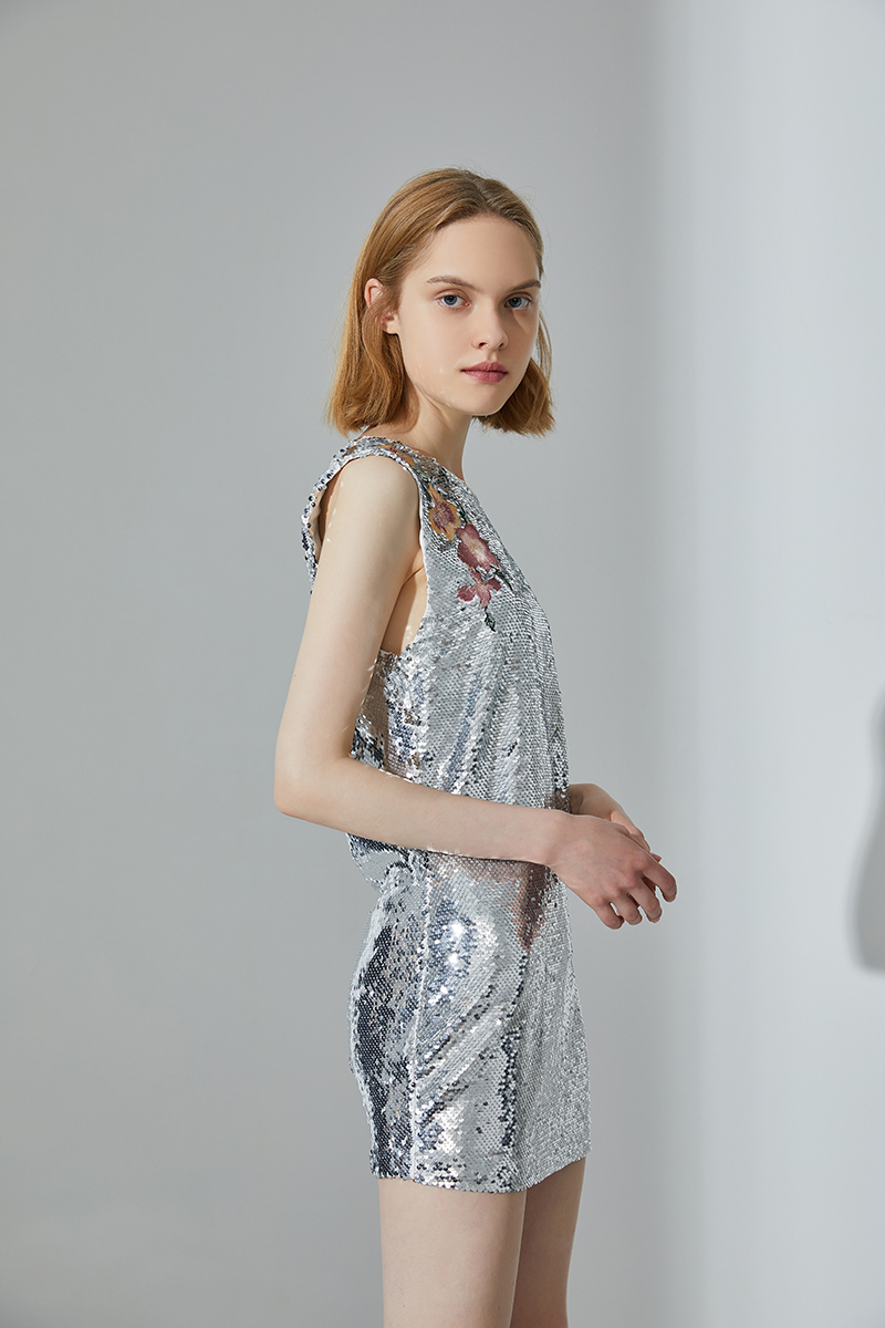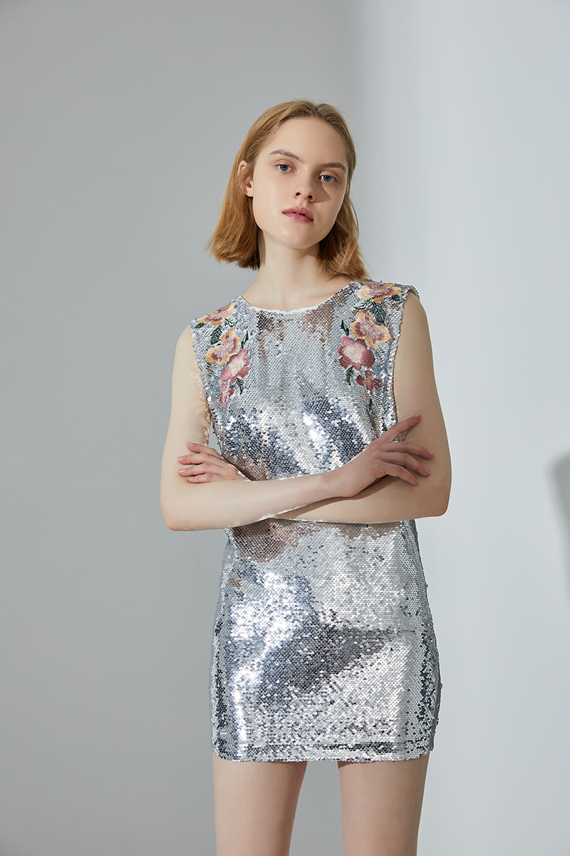 - Design: Elegant and feminine, this mini dress is cut from vintage silver sequins and has an easy silhouette with flower embroidery and easy back-zip entry.