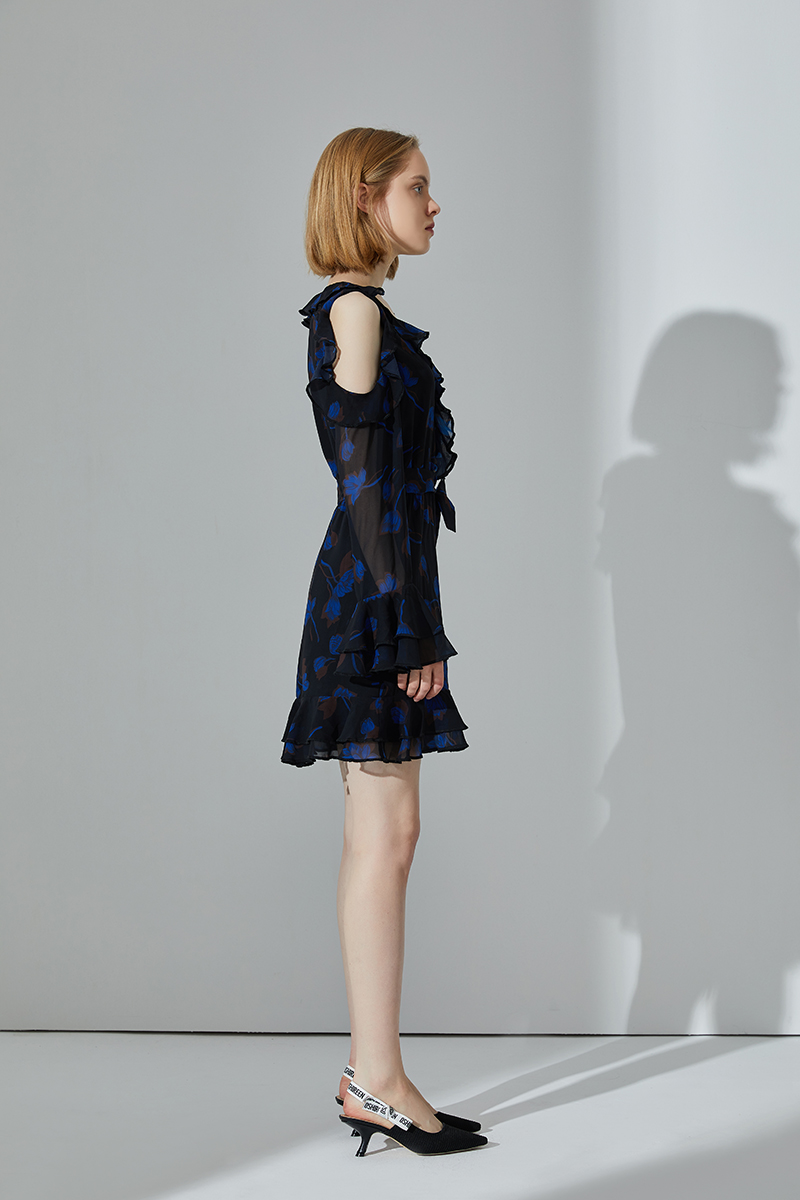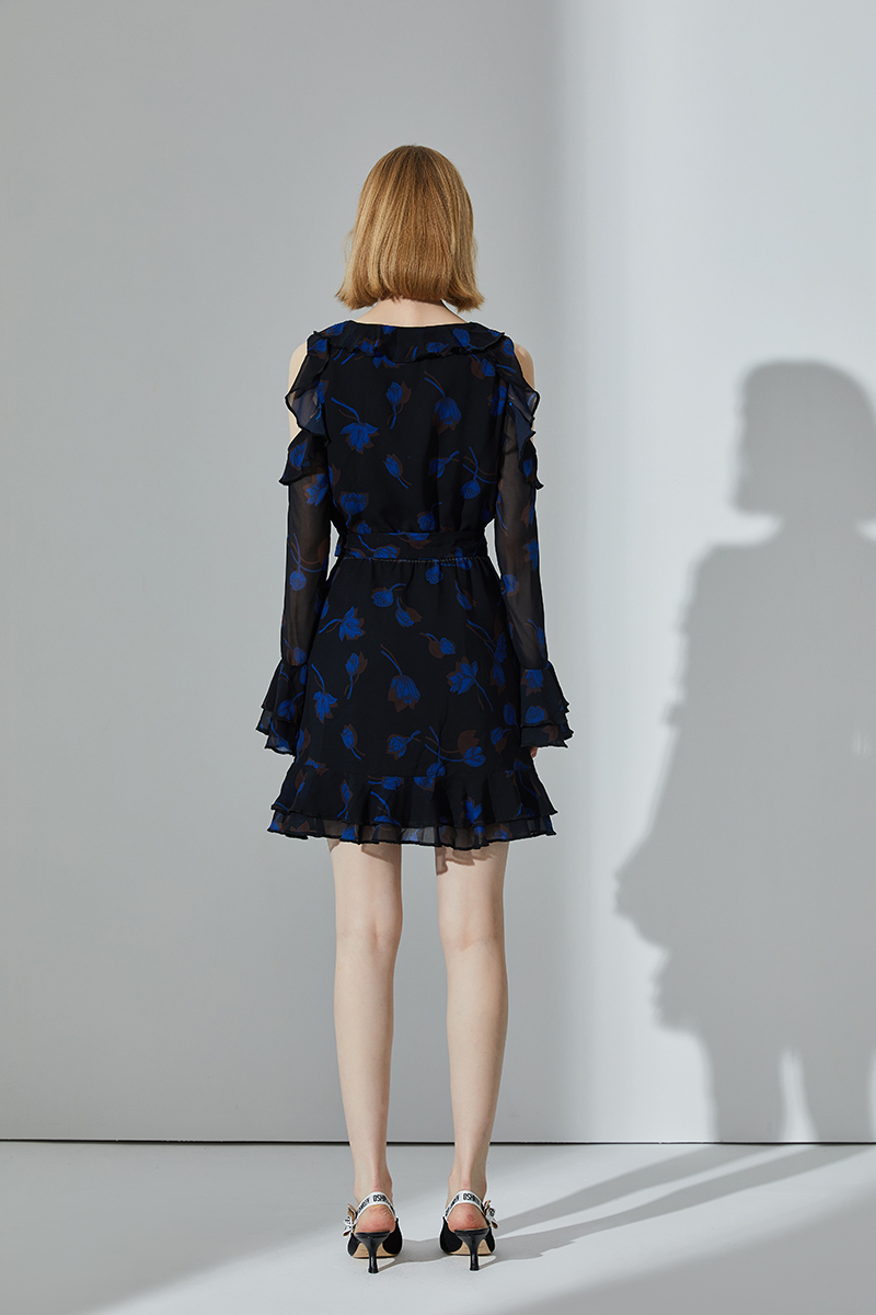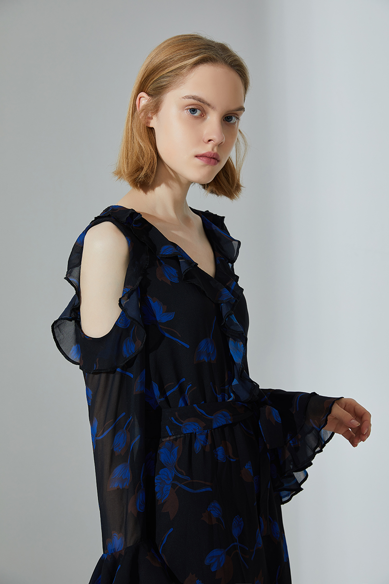 - Design: This dress has a flattering tie-waist, cascading ruffle neckline, and chiffon, cold-shoulder sleeves with ruffle cuffs.