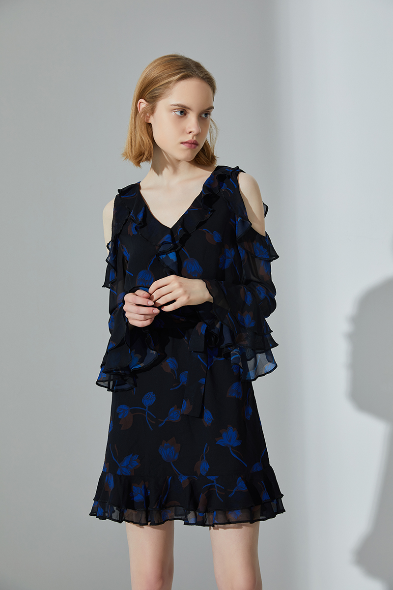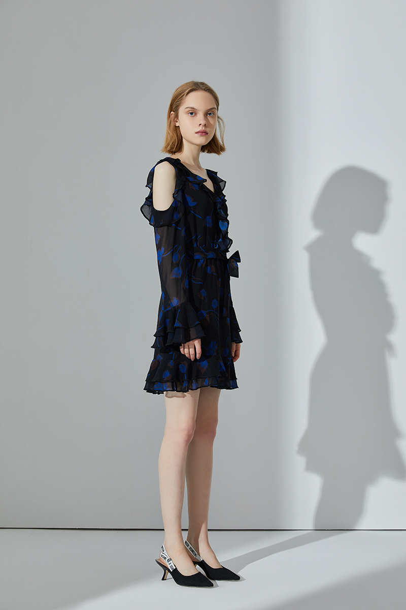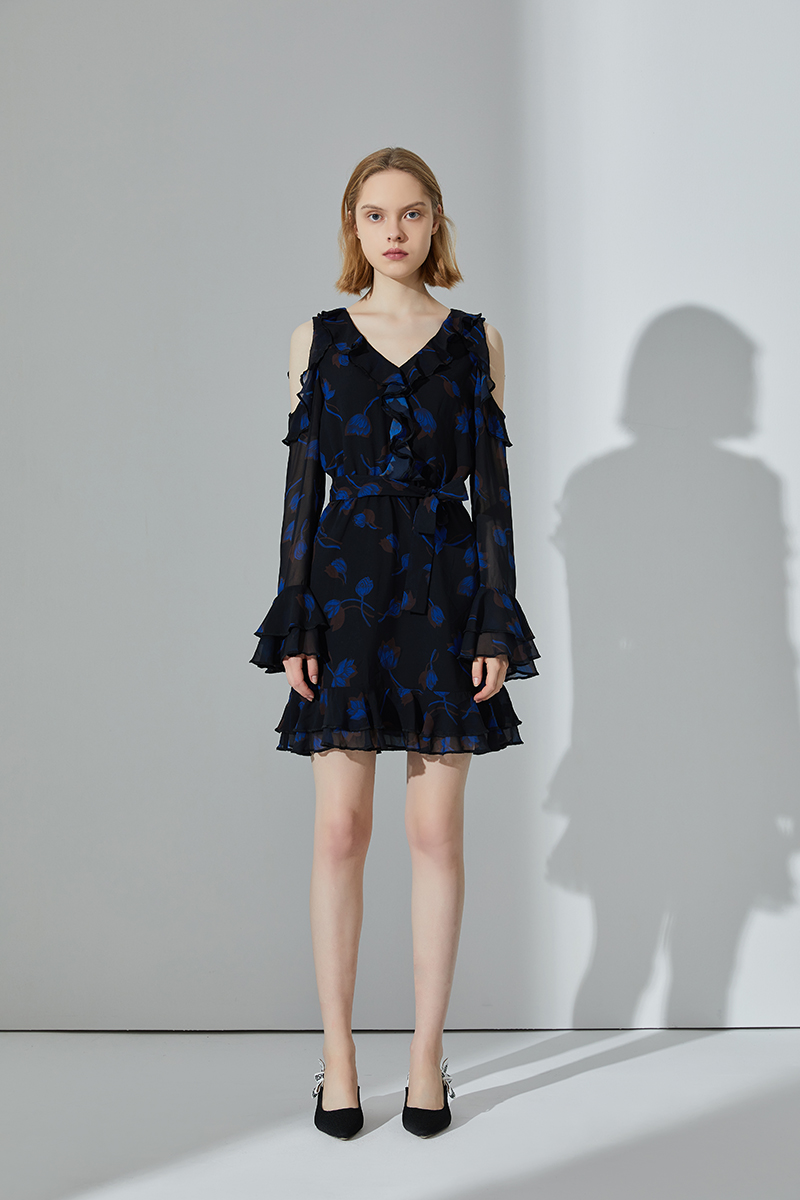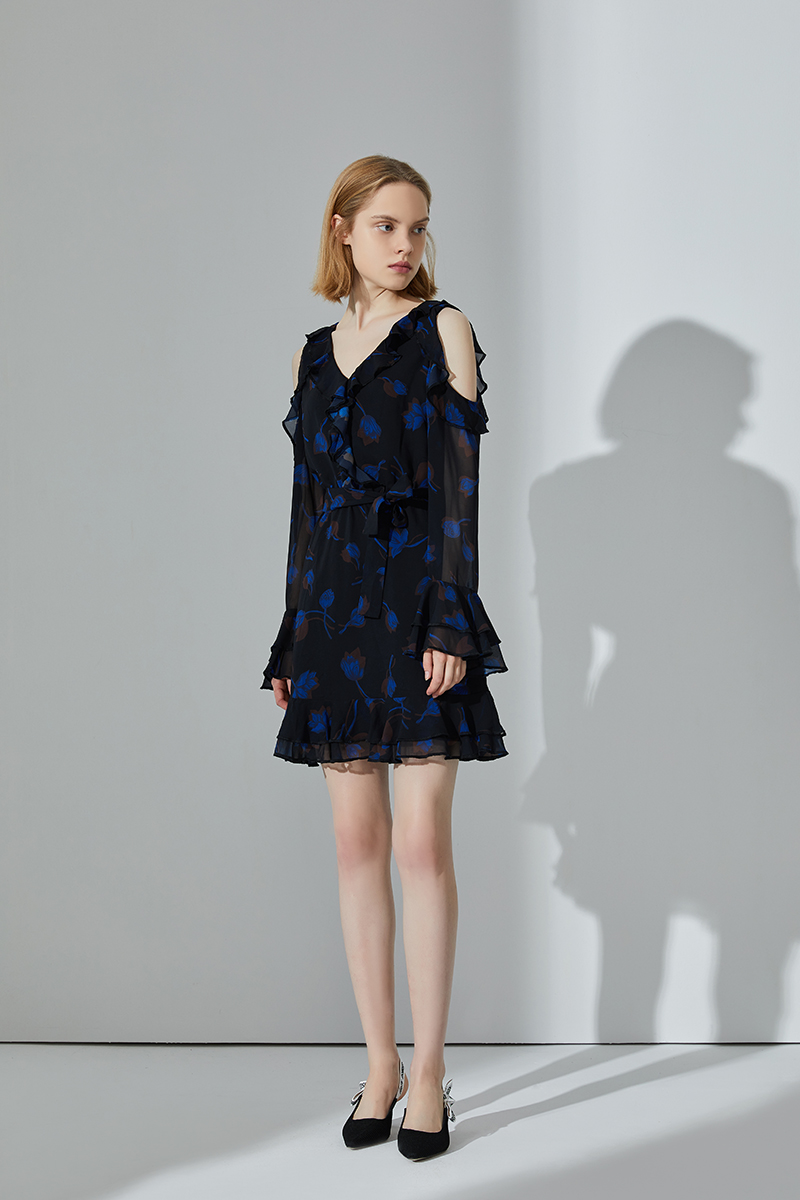 - Design: This dress has a flattering tie-waist, cascading ruffle neckline, and chiffon, cold-shoulder sleeves with ruffle cuffs.