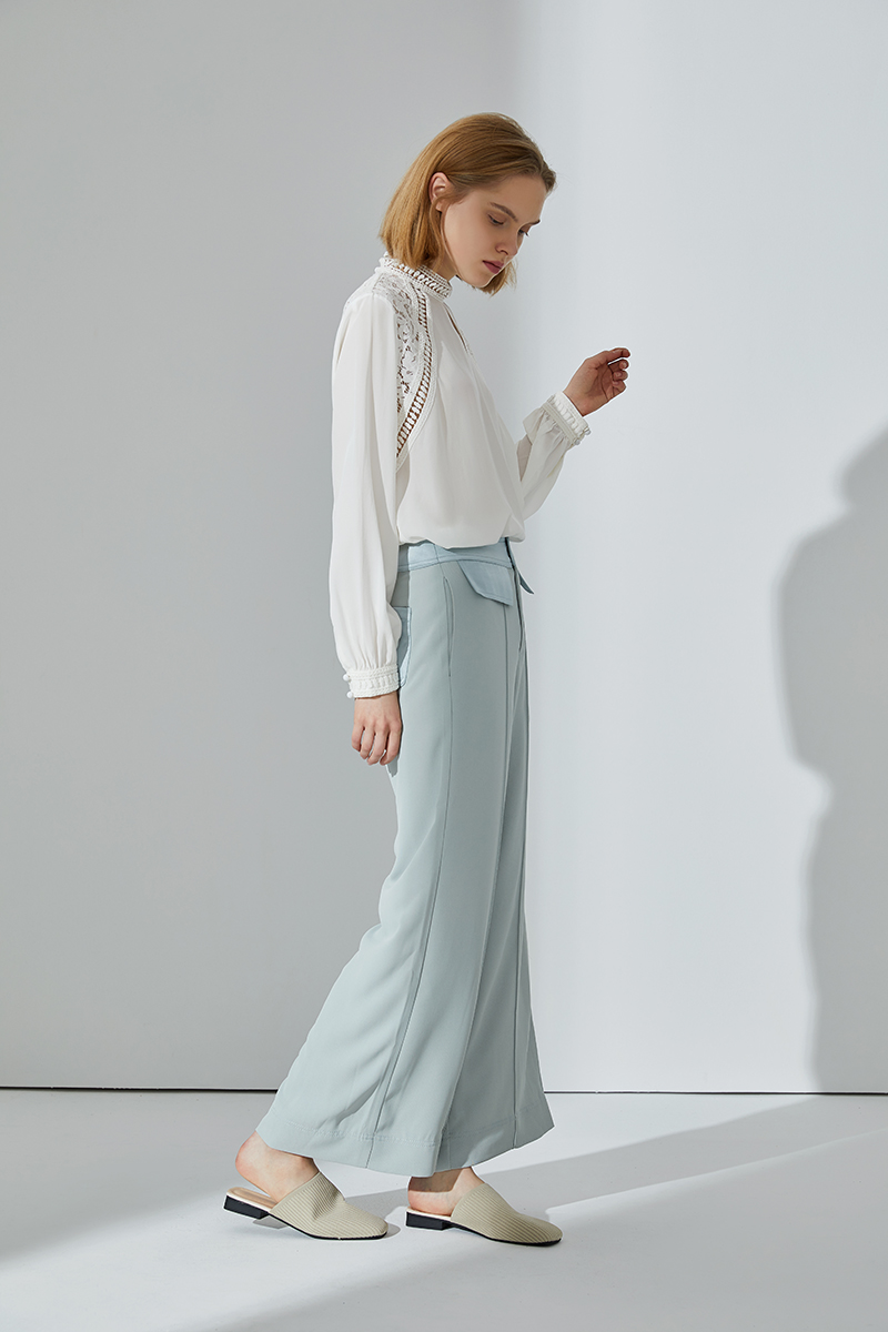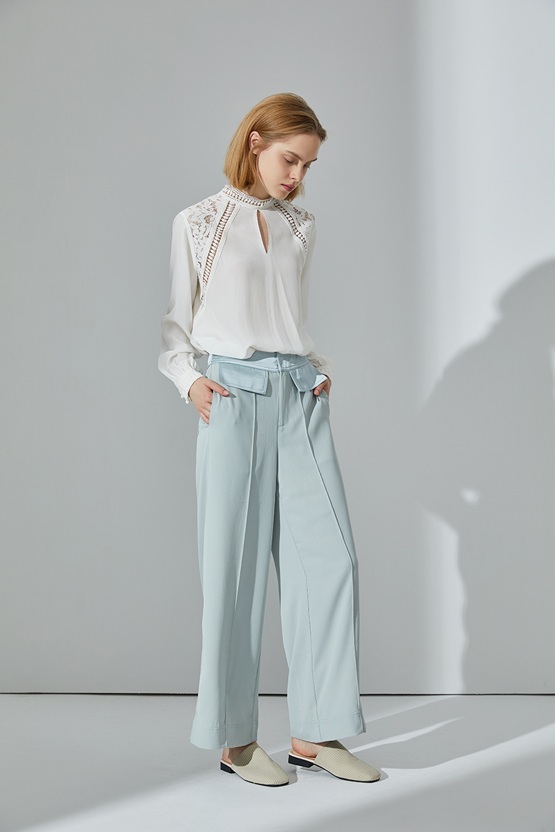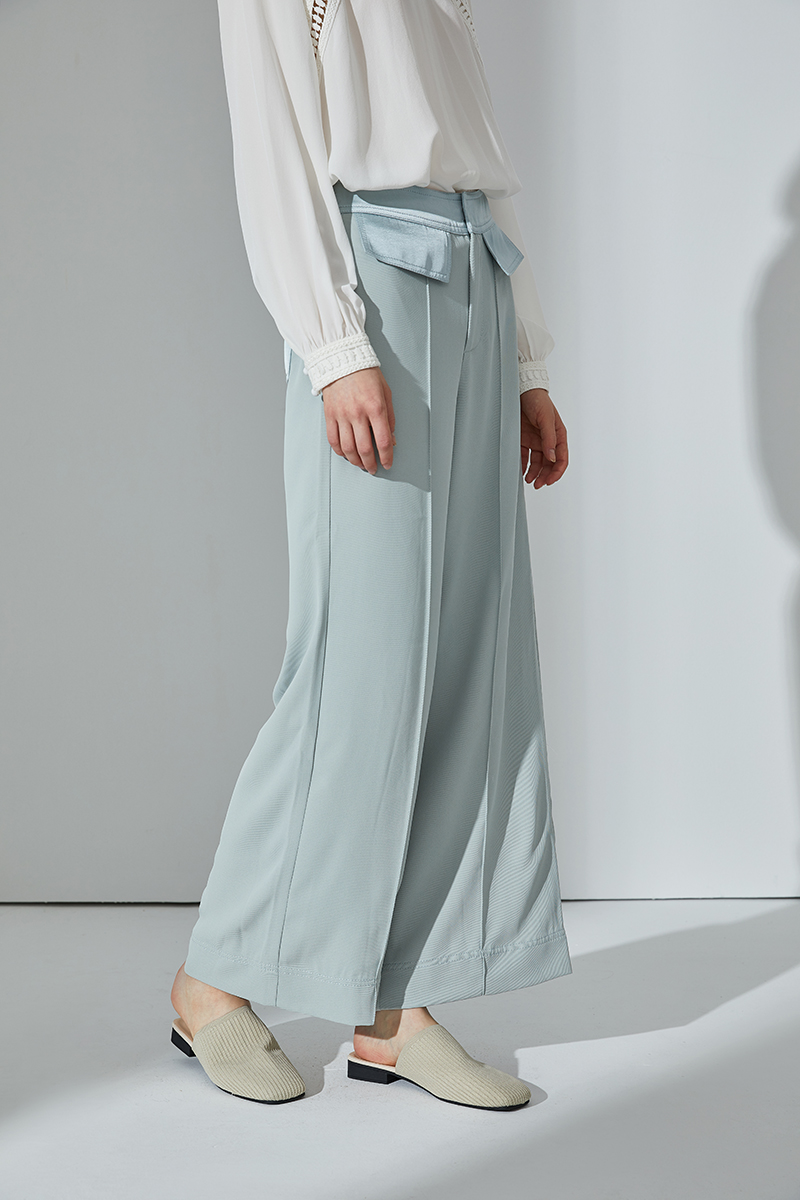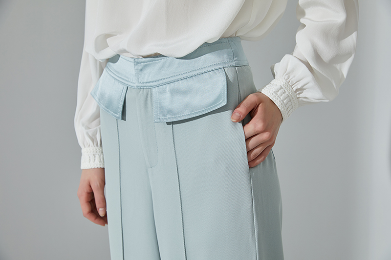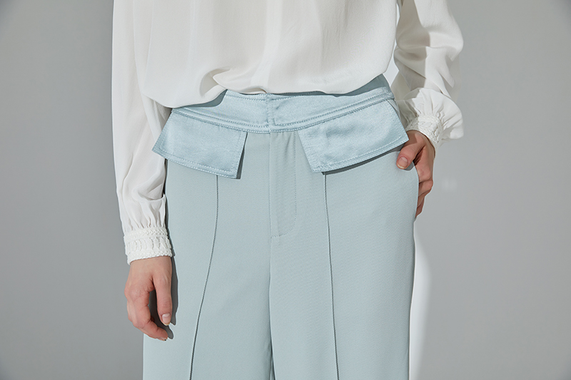 Design: This matte satin pant sits high on the waist design. The front sewn pleats and wide-leg cut highlight the design’s sophisticated style.